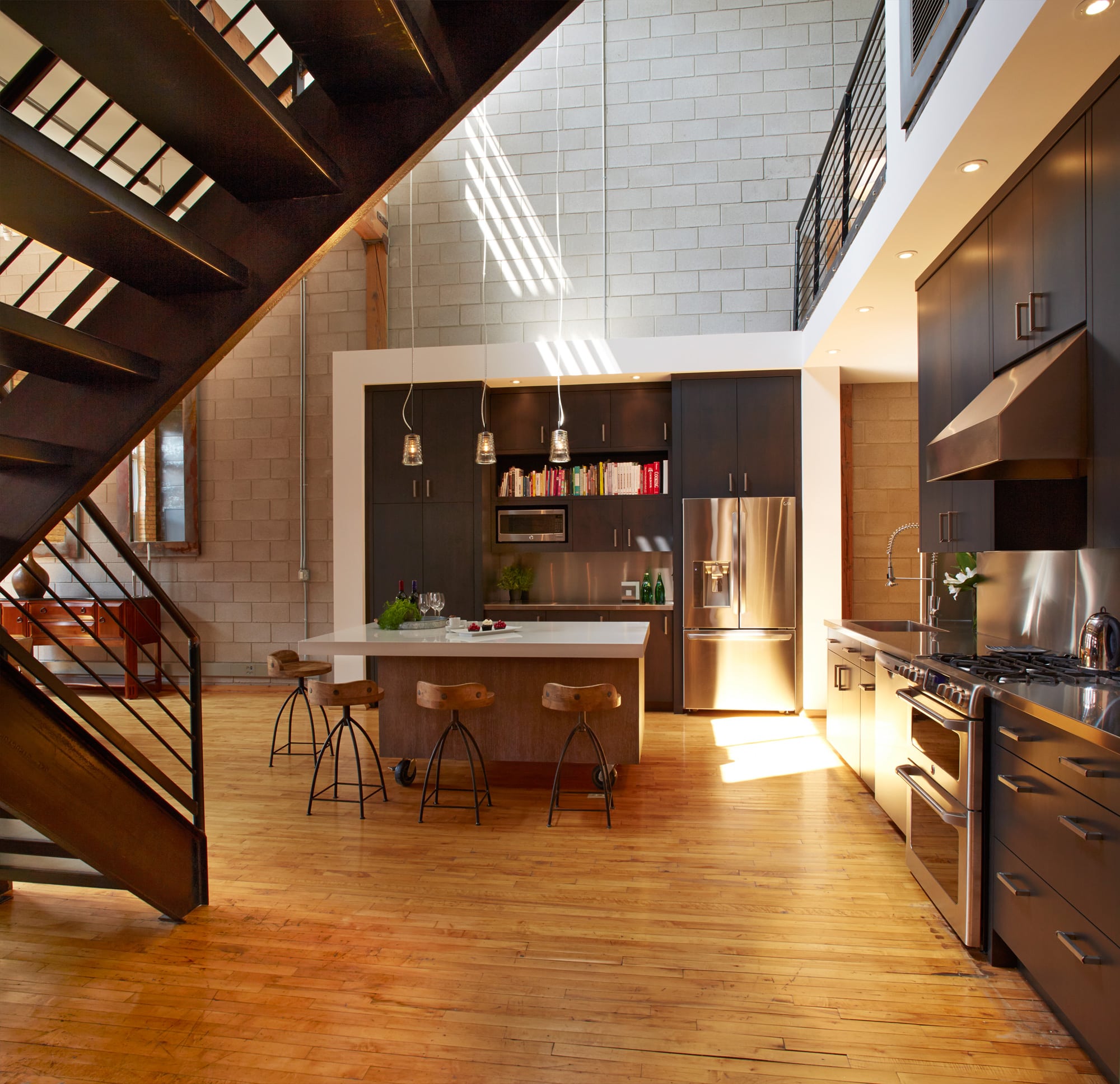 The openness of loft living is part of its draw and one of the many reasons our client purchased this 3-story loft in the North Loop. But they called on us to define designated work, dining, and living spaces, as well as remodel the existing builder-grade kitchen to be more industrial in style. We relocated a steel staircase to create space for a new mezzanine level that would serve as an office. This vision allowed for the perfect spot for lounging and wine storage directly below the mezzanine. And to serve as an artful and industrial divider between the living and dining spaces, we replaced the tiny gas fireplace, with a dramatic, 3-sided fireplace that soars two stories high.