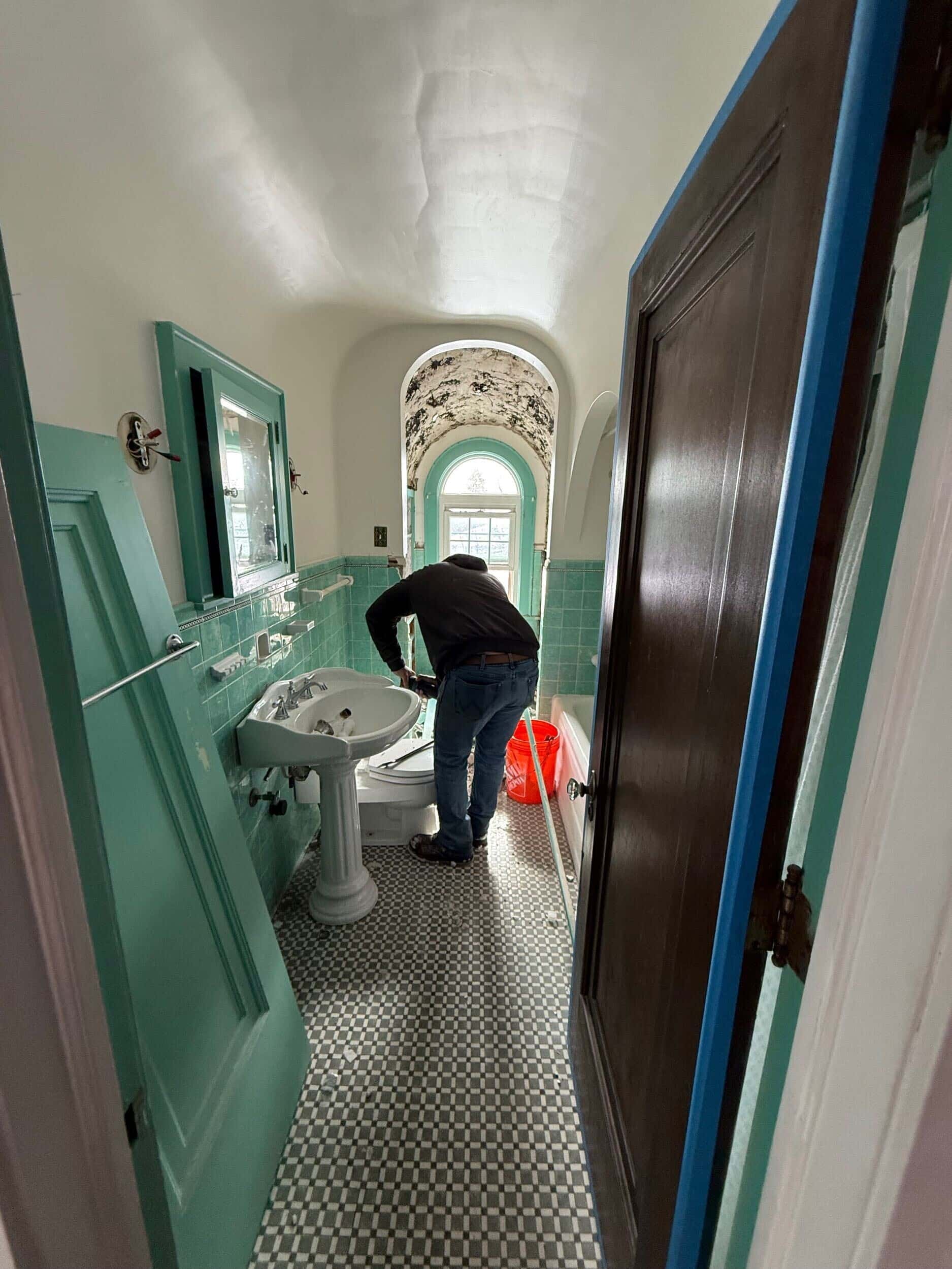 When our clients decided to address water damage in their 1928 Tudor’s main bathroom, they saw an opportunity to reimagine the space entirely. The design team preserved the spirit of the original Art Deco era bathroom through a fresh interpretation—centering the remodel on a vivid swan wallpaper meaningful to the couple. The renovated space features a reconfigured layout with a large walk-in shower, a generous vanity, and improved storage. The project expanded to include an entirely new primary en-suite bathroom inspired by the dark, moody Icelandic spas the homeowners frequent. Featuring custom black tadelakt plaster, a soaking tub, a spacious walk-in shower, and a double vanity, the dramatic space results in a luxurious retreat that feels as though it’s always belonged in this historic Nordeast home.