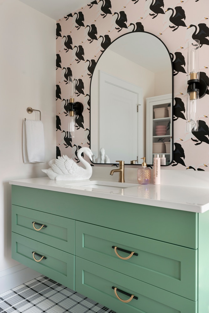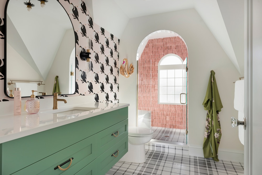 “To honor the spirit of the original bathroom, we intentionally leaned back into the pink-and-black palette— with a fresh interpretation. The design came together around an incredible black-and-soft-pink swan wallpaper, a perfect nod to the original aesthetic and a meaningful detail for the clients, who love swans.” – White Crane Designer