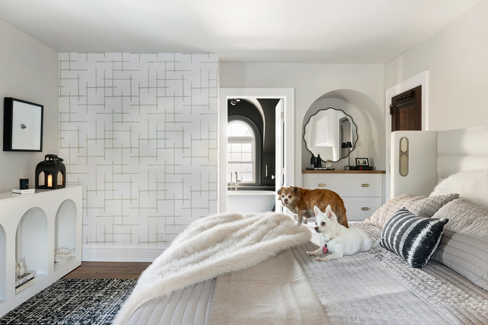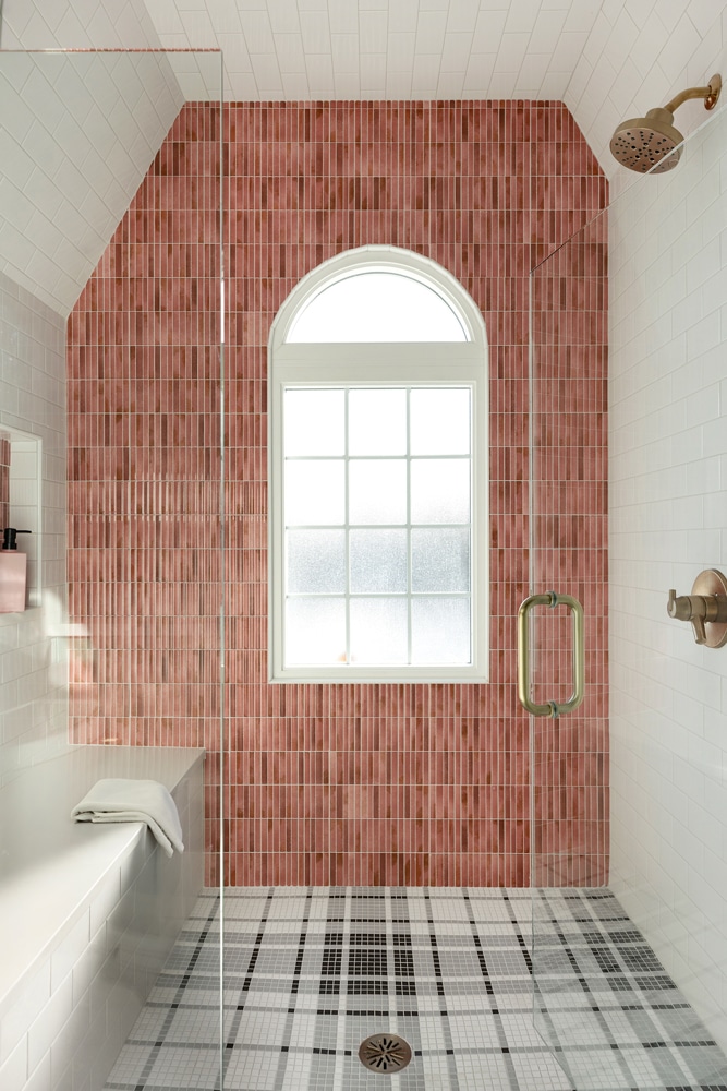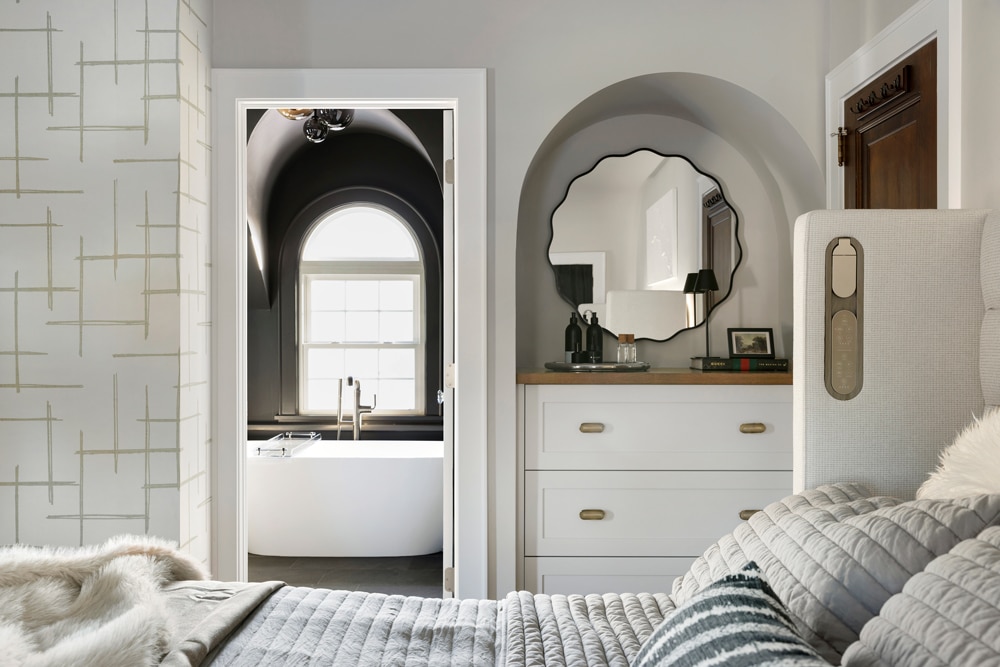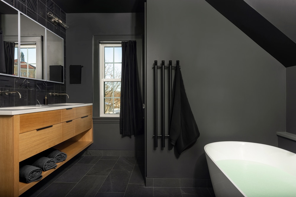 When our clients decided to address water damage in their 1928 Tudor’s main bathroom, they saw an opportunity to reimagine the space entirely. The design team preserved the spirit of the original pink-and-black bathroom through a fresh interpretation—centering the remodel on a vivid swan wallpaper meaningful to the couple. The renovated space features a reconfigured layout with a large walk-in shower, a generous vanity, and improved storage. The project expanded to include an entirely new primary en-suite bathroom inspired by the dark, moody Icelandic spas the homeowners frequent. Featuring custom black tadelakt plaster, a soaking tub, a spacious walk-in shower, and a double vanity, the dramatic space required structural modifications to the vaulted dormer walls—resulting in a luxurious retreat that feels as though it’s always belonged in this historic home.