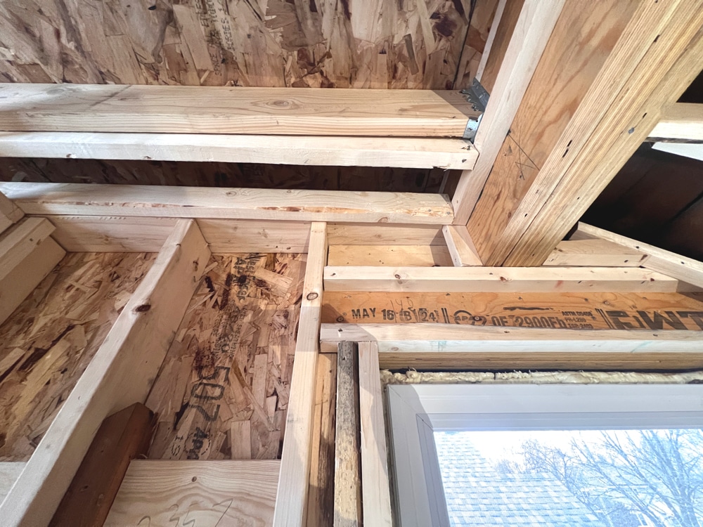 We removed the single 1×6 board, installing a stronger, 5.25″ x 14″ microllam beam, that spanned the entire length of the roof. Instead of weight from the roof transferring primarily to the exterior walls, as it had for 80+ years, much of that structural load now radiates from the microllam beam down to a bearing point in the middle of the house, then all the way to the basement and foundation below.