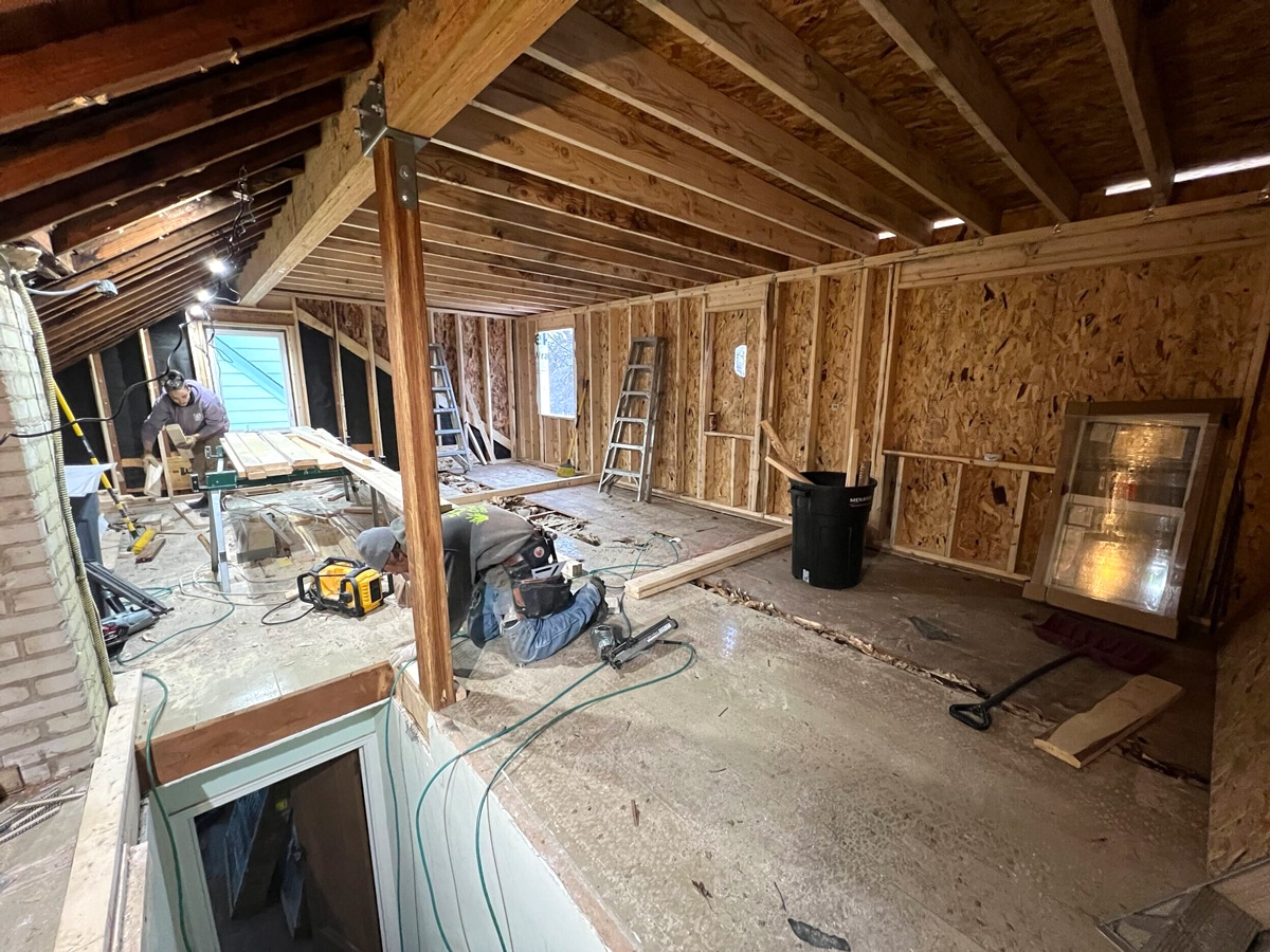 With interior demolition complete and weather delays behind us, our framing crew readied themselves to build out the updated plans for this Southwest Minneapolis attic. As the design called for the construction of a full shed dormer along the back of our client’s 1941 home, the team would not only create interior framing and new exterior walls, but we would also need to make structural modifications to accommodate a shift in weight distribution throughout the building.