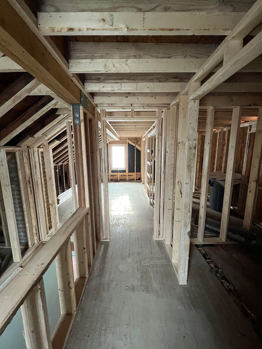While the exterior framing may have redefined the home’s architecture, our client’s vision of an upgraded bedroom, new bathroom, and bonus room was made real with interior framing. For nearly all of the redefined interior walls, we leveraged standard 2×4 lumber for framing, except where plumbing rough-ins necessitated deeper wall cavities.
