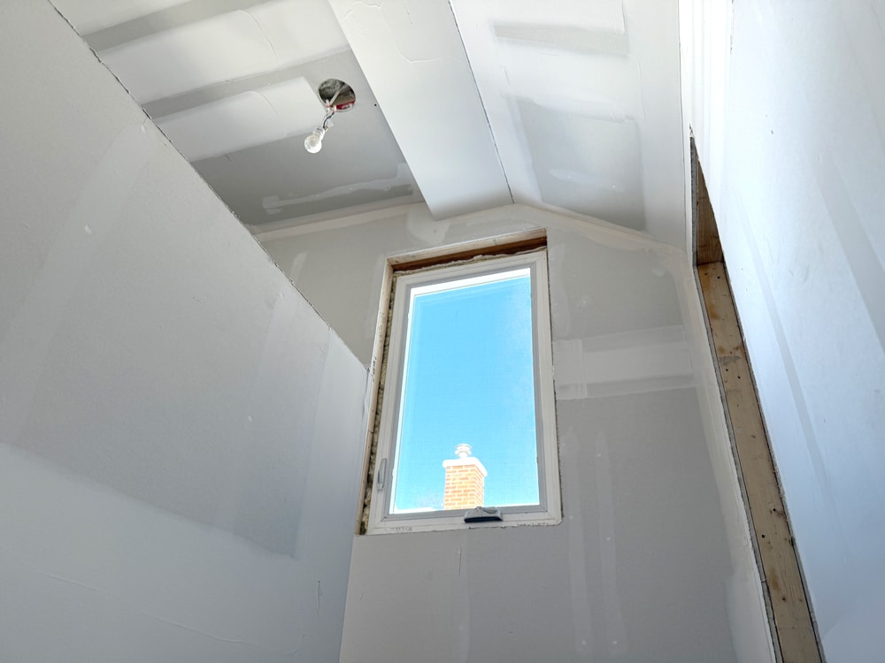Before the first sheet could be hung, the crew had to solve a logistics problem we commonly face in older homes: how do you get enough drywall for an entire upper level into a space with narrow stairs and no other direct access?