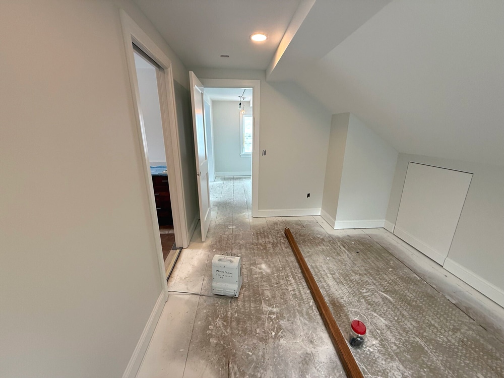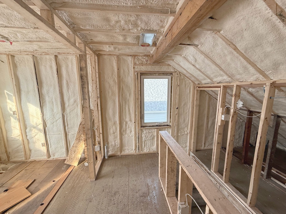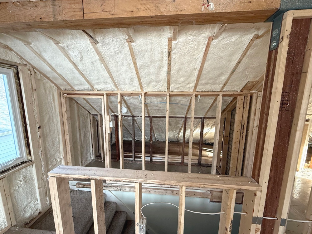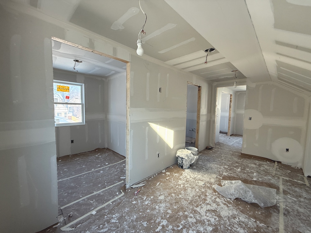 “In an older house like this, the logistics of getting drywall sheets to the attic are different than new construction. You know, typically, we can only use 4×8 sheets, whereas, in new construction, you can use much larger 4×10 or 4×12 sheets.” – White Crane Project Manager