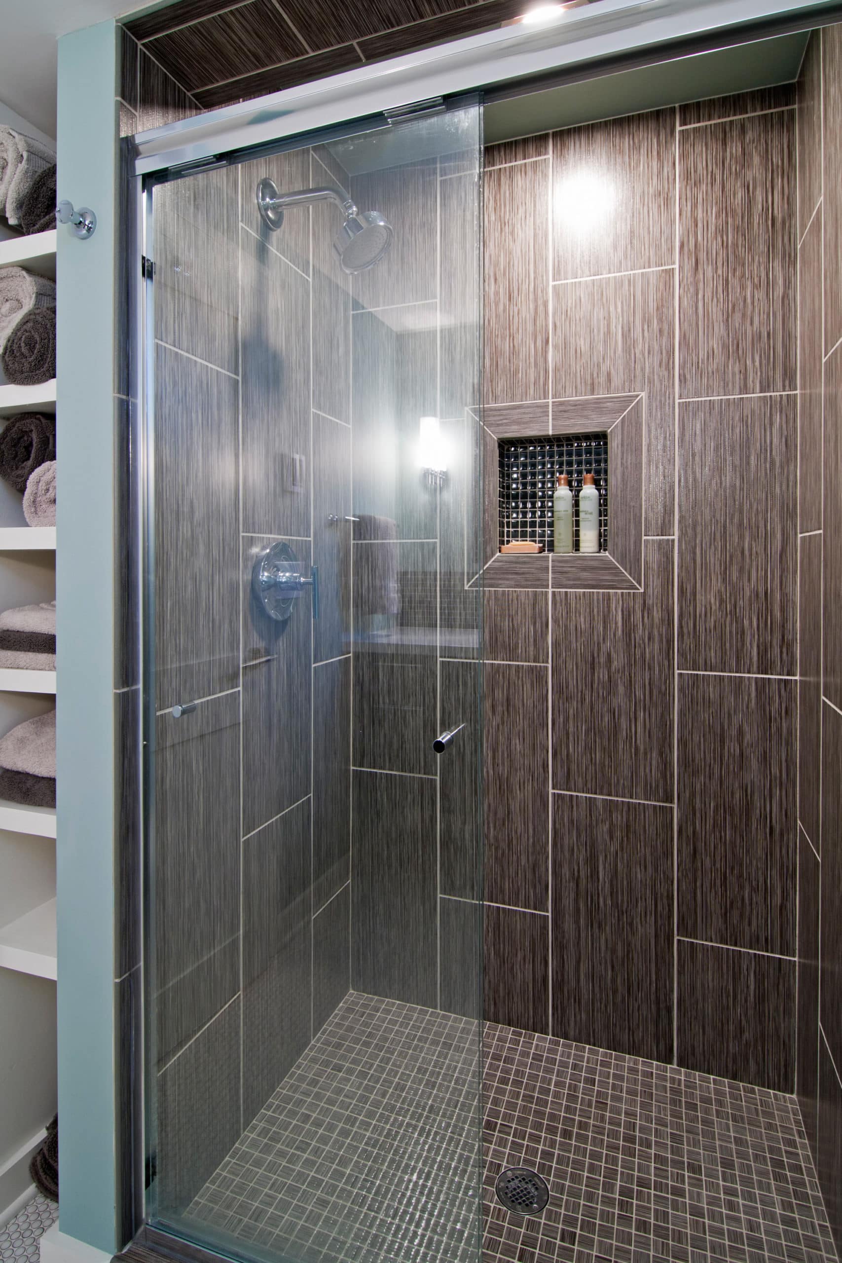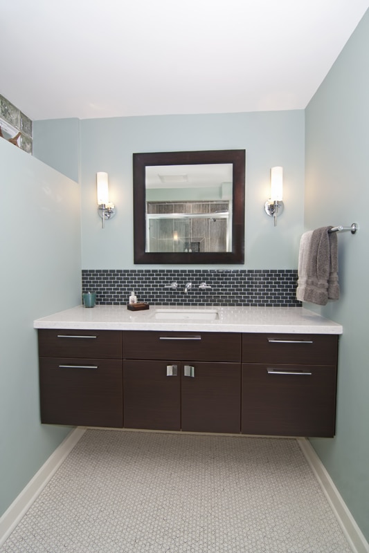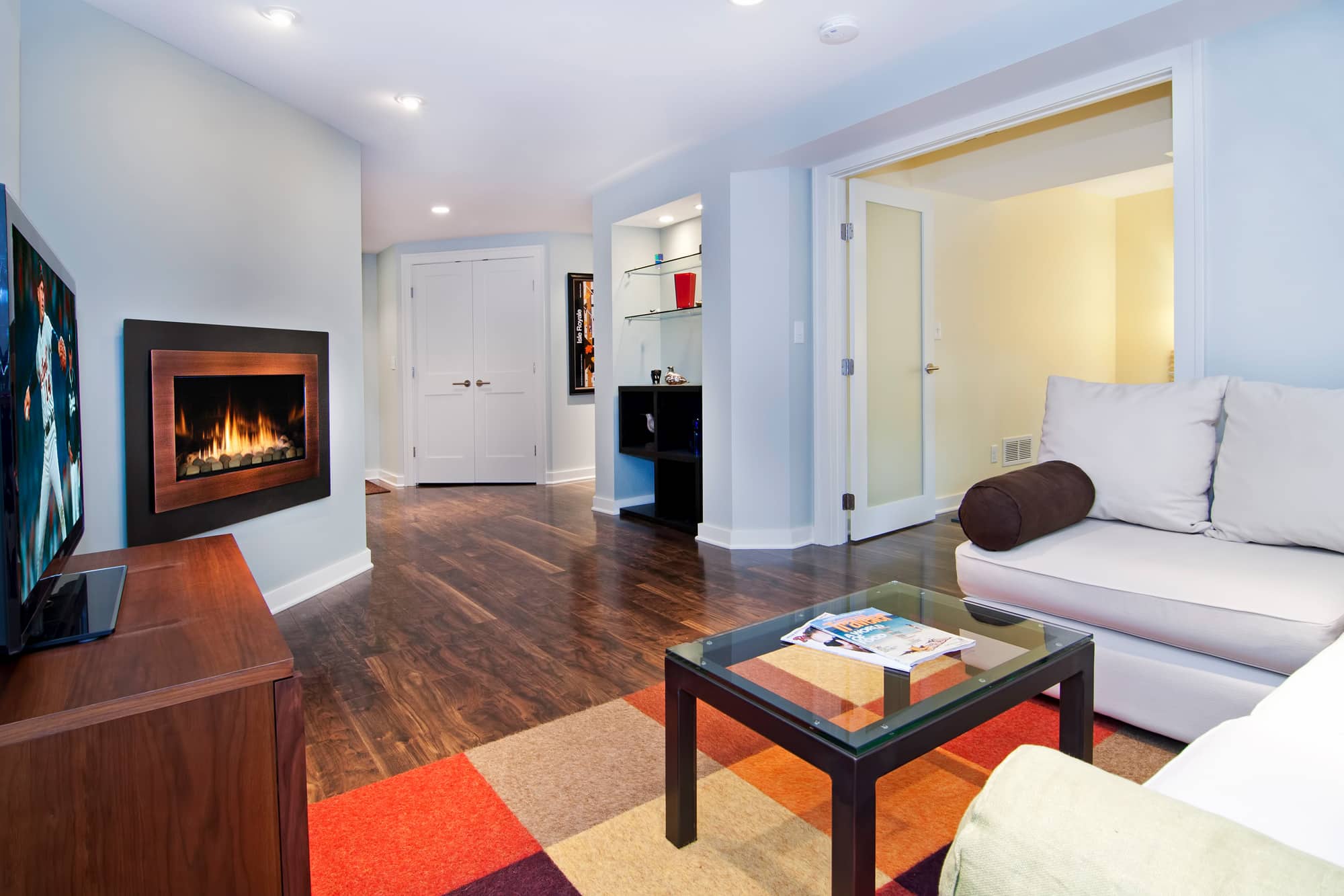 This client wanted their typical Minneapolis unfinished basement to be a bright and cozy space that would include a family room, bedroom, bathroom, and laundry room. We began by installing new footing and beams that were required to open the space. Cement floors were leveled and partially replaced. The living room features a radiant heat fireplace and a built-in wall niche with floating shelves. Adjacent to the living room is the guest bedroom. The rooms are separated by French doors to create privacy and invite the light to shine in from the doublewide egress window. The new bath is modern and fresh, featuring a custom tiled shower, floating vanity, and a built-in for storage. Walnut laminate flooring runs throughout the space, and a custom maple staircase leads to the 1st floor.