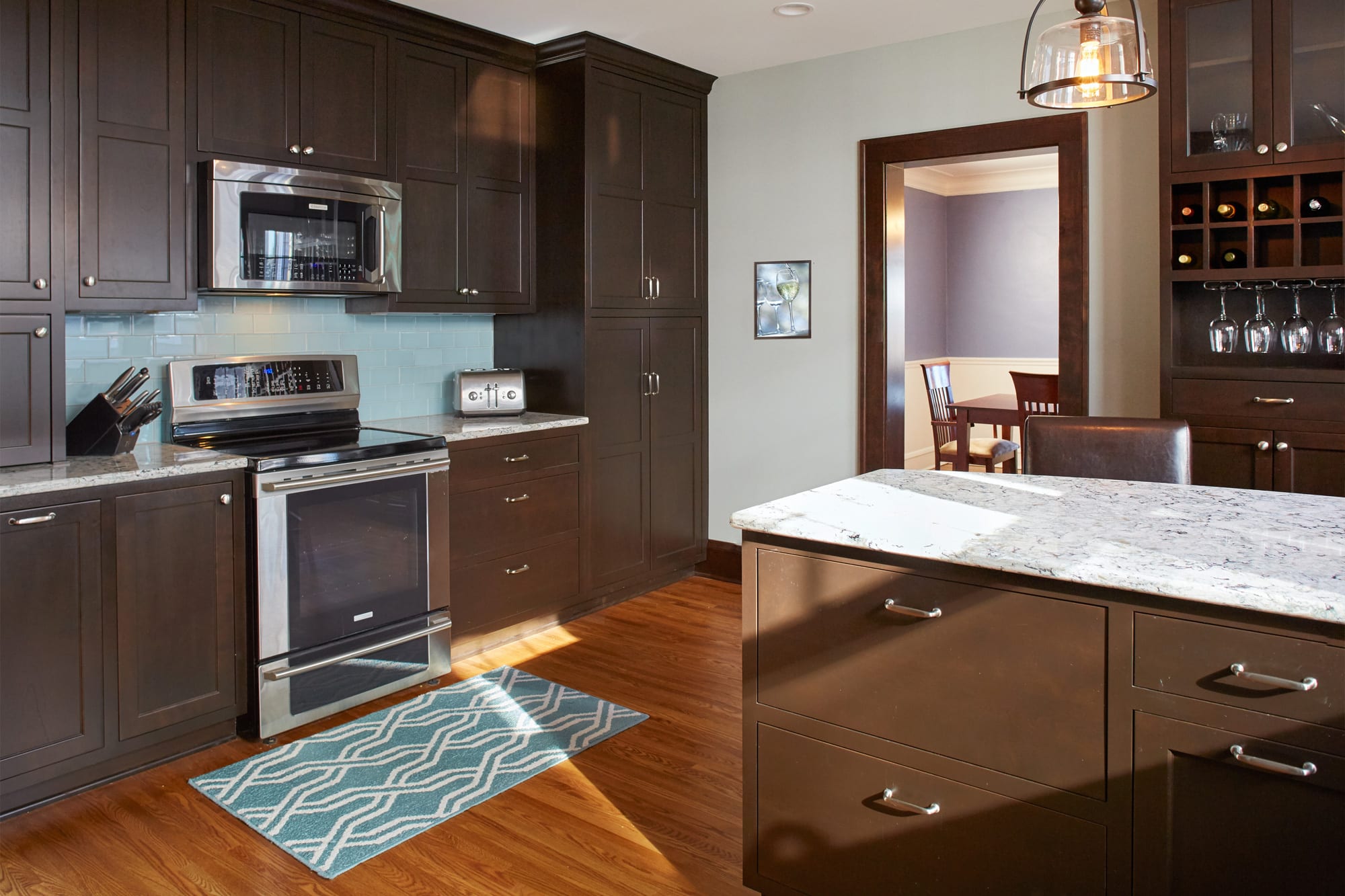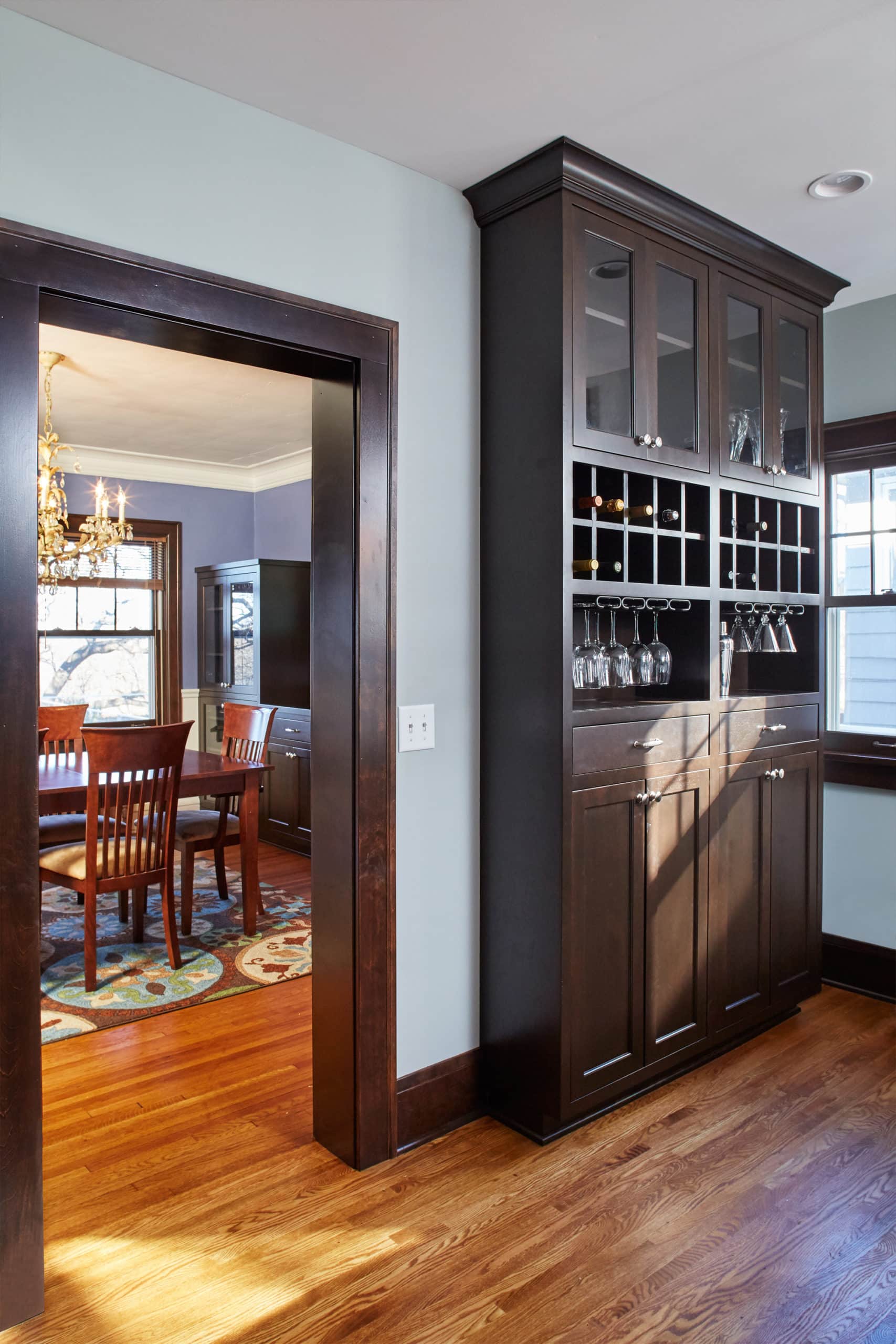 We’ve worked with this Lake Nokomis area family over the course of several remodels. In this project, our clients asked us to create a kitchen that aligned with the character of their 1926 home with the addition of some necessary updates. To start, we opened up the space by gutting the original kitchen and incorporating what was once the butler’s pantry into the now, much larger room. Birch cabinets with dark stain match the home’s thick baseboards and oak floors. Complimenting neutral tones on the walls, backsplash, and quartz countertop create a timeless charm that fits with the character of the rest of the home. In the dining room, a custom built-in matching the kitchen cabinets tie both rooms together.