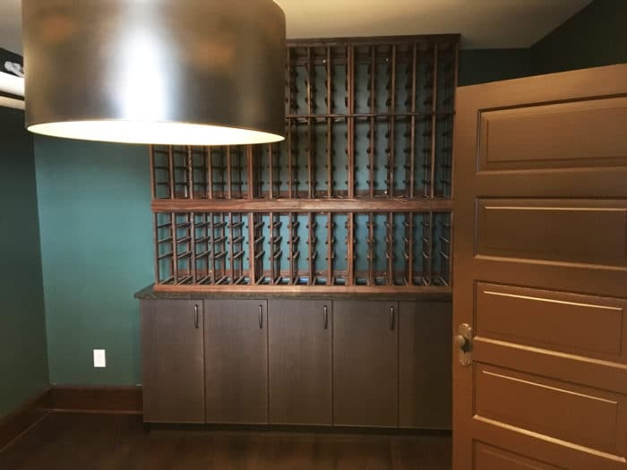 Here's a look at the wine and poker room just before project completion, featuring a custom wine rack and bronze drum light fixture.